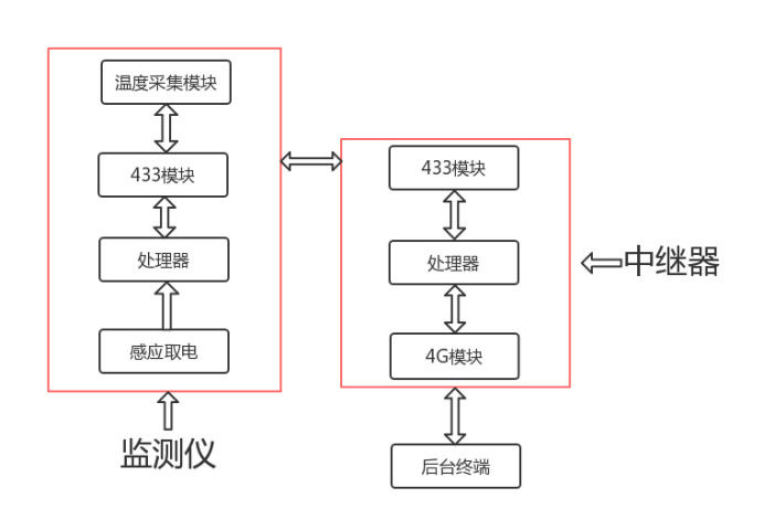電纜頭測(cè)溫監(jiān)測(cè)儀通過(guò)自取電的方式進(jìn)行供電,節(jié)省了空間和成本,自取點(diǎn)也確保了設(shè)備的壽命不會(huì)因?yàn)楣╇姷脑蚩s短,在工作期間處理器把溫度采集模塊采集到的數(shù)據(jù)通過(guò)LORA模塊發(fā)往中繼器,中繼器上的LORA模塊接受到數(shù)據(jù)后處理器利用4G模塊把測(cè)溫?cái)?shù)據(jù)發(fā)往后臺(tái)系統(tǒng),完成一個(gè)完整的工作內(nèi)容。接地電流的采集也是同理,利用零磁通互感器采集電流,從而完成數(shù)據(jù)的上傳。